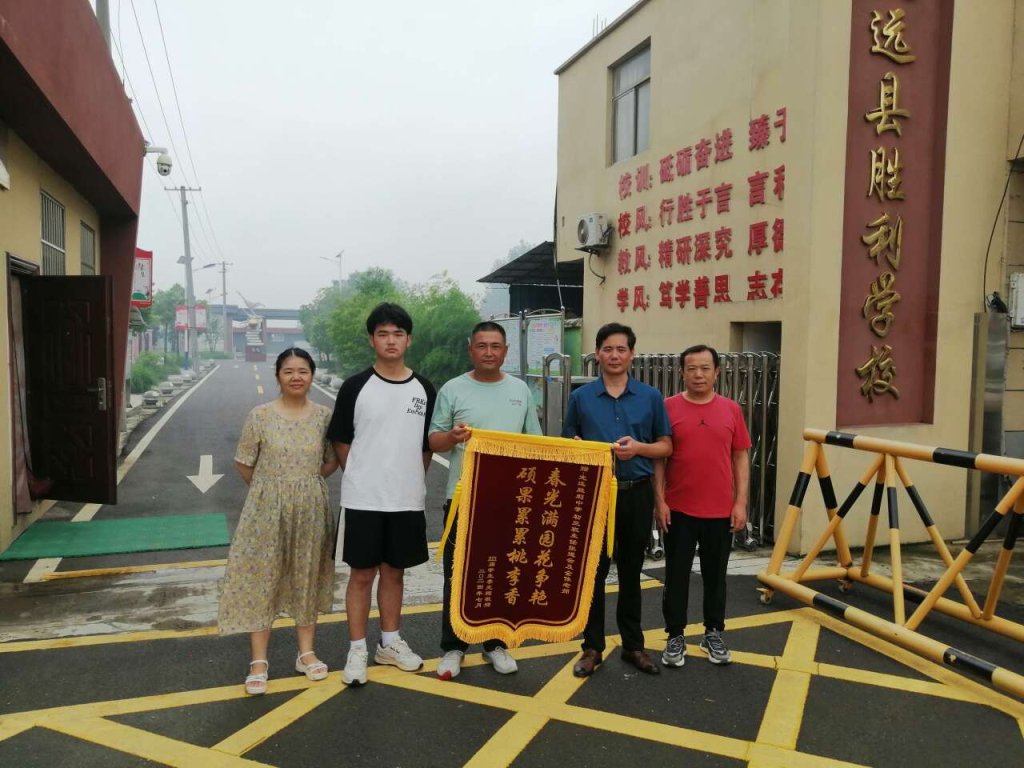~ 7月15日上午,定远县胜利学校初中部2021届学子李光辉的家长满怀感恩之心,把绣有“春光满园花争艳 硕果累累桃李香”的锦旗送到了学校,以此表达对学校及老师的感谢。学校党支部副书记李朝接受锦旗,并与学生家长合影留念。