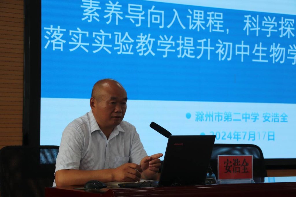 ~ 来自滁州市第二中学的安浩全老师作了题为《素养导向入课程,科学探究促发展》的主题讲座。讲座主要从滁州市初中生物教学教研现状出发,解读了义务教育生物学课程标准,强调了落实实验教学、提升课堂教学品质的实践做法和重要意义,同时,提出了要重视初中生物学实验教学的建议。