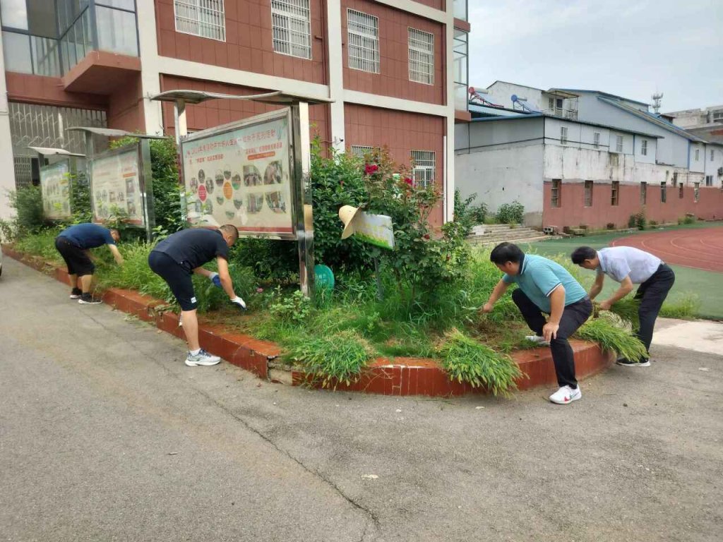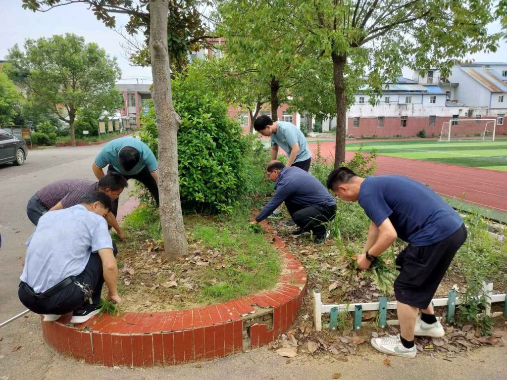 ~ 为进一步美化校园环境,丰富党员组织生活,把主题教育实践活动落实到行动中,7月18日,定远县朱湾初级中学党支部组织全体党员在校园开展“行动践初心 除草助绿化”主题党日活动。以实际行动彰显“服务育人”“劳动育人”的党建工作宗旨。