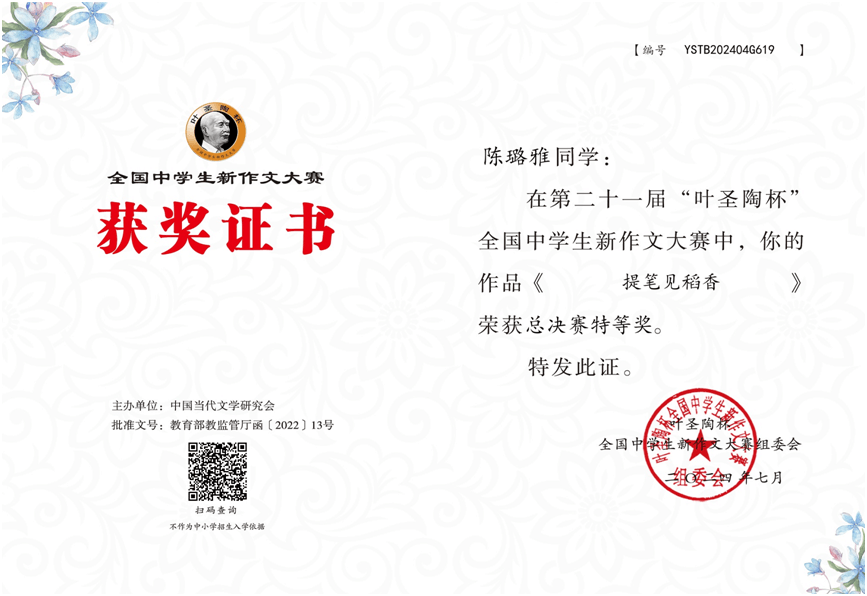~ 在 2024 年 5 月,我有幸参与了叶圣陶杯作文大赛。这次经历,如同一扇窗户,让我得以窥见文字世界的无限魅力。参与这场意义非凡的大赛,更像是与众多智者进行了一场深入灵魂、发人深省的深度对话,是一次心灵的深刻启迪与纯净洗礼。