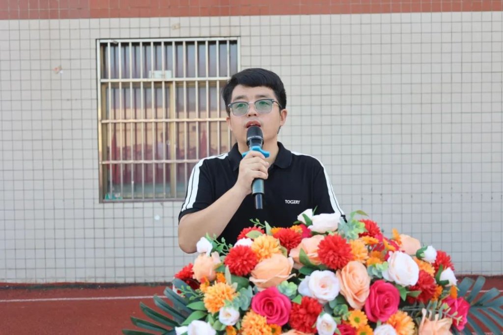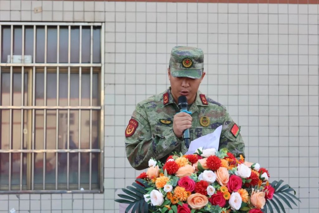 ~ 教官代表芮千松发言。他向参训学员指明了军训需要完成的任务,并提出了相关要求,他希望同学们能用优异的训练成绩为高中生活开好头、起好步,成长为新时代的追梦人。