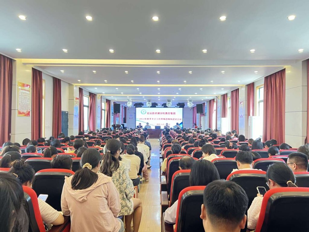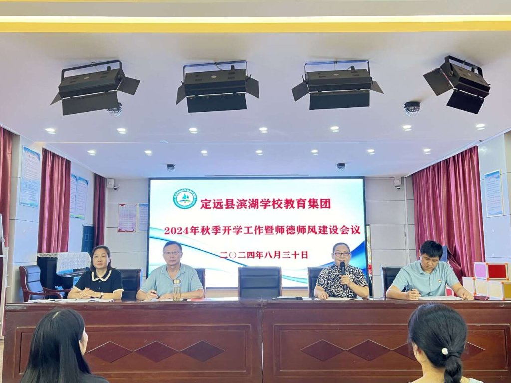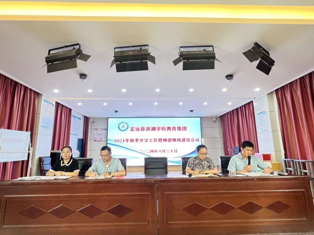 云天收夏色,木叶动秋声。2024年秋季新学期即将开始,为确保新学期各项教育教学工作平稳有序开展,明确各部门、各年级、各班级的工作职责与目标,2024年8月30日,定远县滨湖学校教育集团组织召开了2024—2025学年度第一学期开学工作暨师德师风建设工作会议,就师德师风建设、教学工作、安全与后勤、班级管理等方面工作进行全面部署。会议由集团党支部副书记汪秀芝主持,集团新区小学负责人吴德清、集团滨湖小学执行校长周琼、集团新区小学副校长周伟伟及全体教师参加会议。