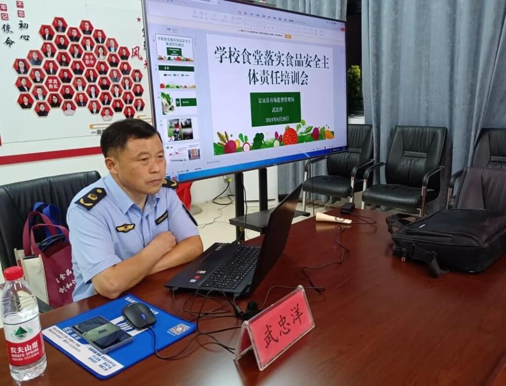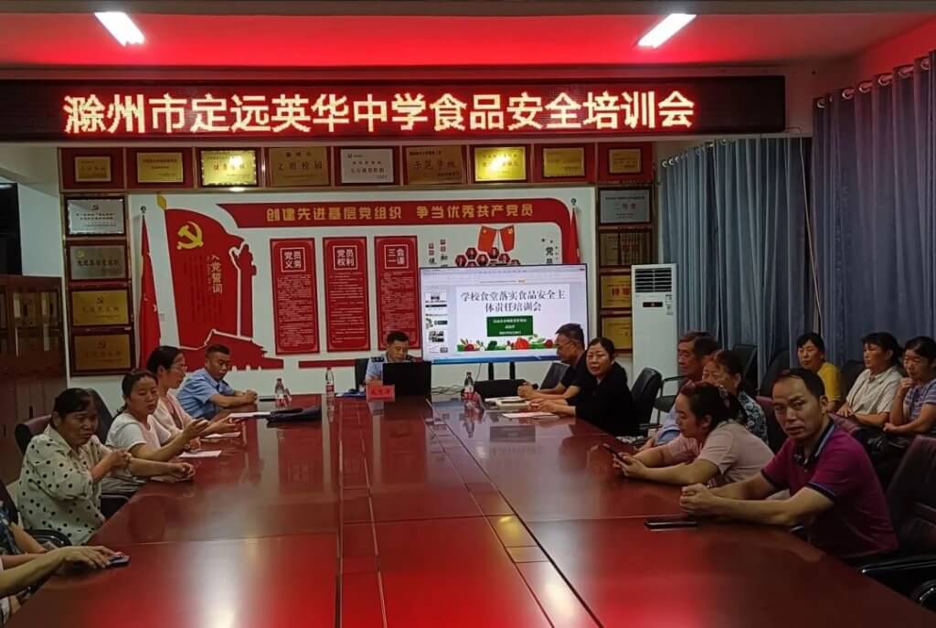 ~ 为进一步加强和规范校园食品安全管理,2024年8月30日,定远英华中学邀请定远县市场监督管理局餐饮股长武忠洋、曲阳所党支部书记姬晓三来校指导培训工作。学校安全总监、后勤部负责人、食品安全员和膳食科、采供科全体员工参加了会议。