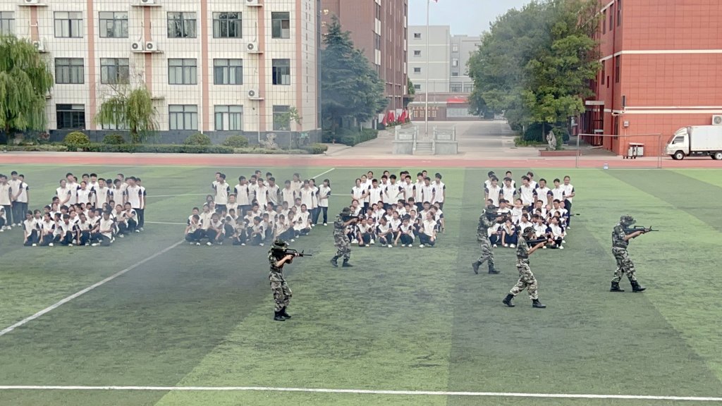 ~ 9月7日,定远县育才学校七年级新生军事素养训练闭营仪式在学校运动场举行。董事长孔祥雷、总教官鲁晓明等参加。