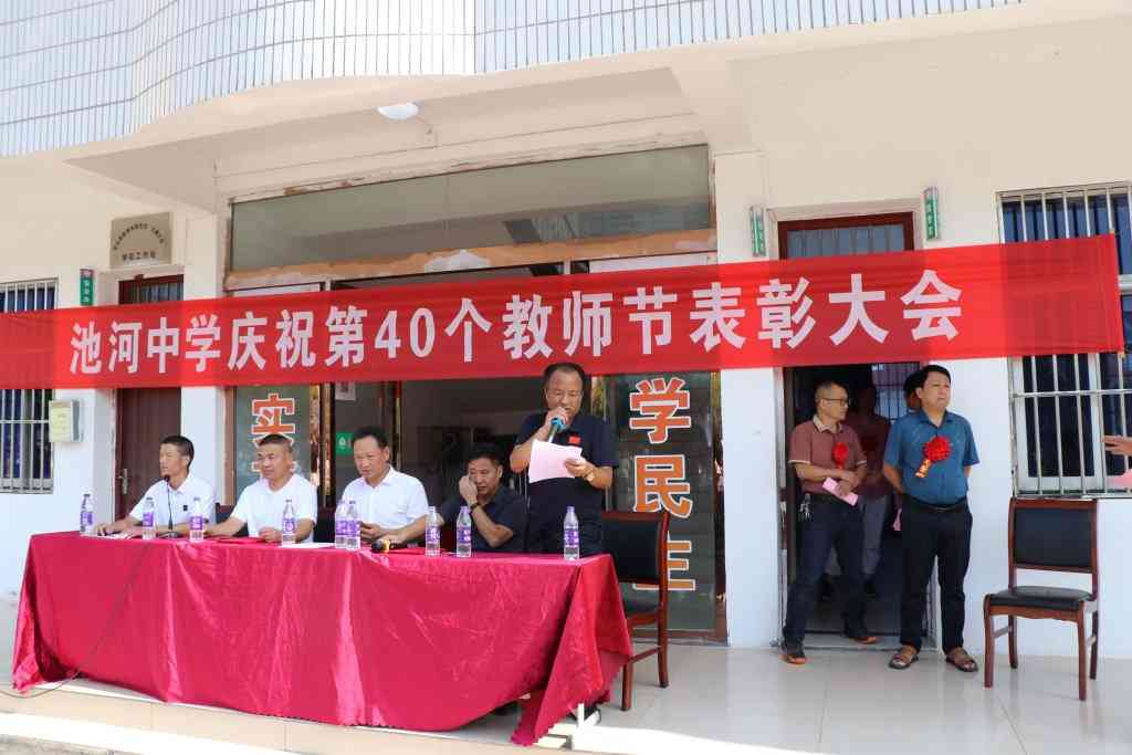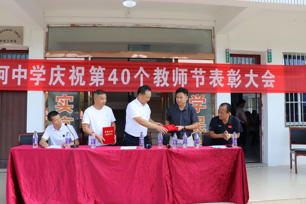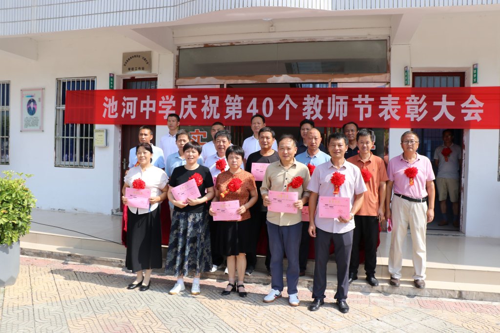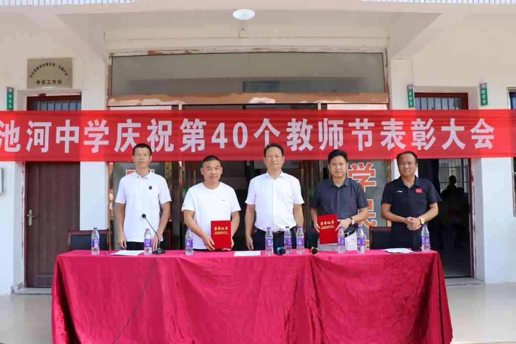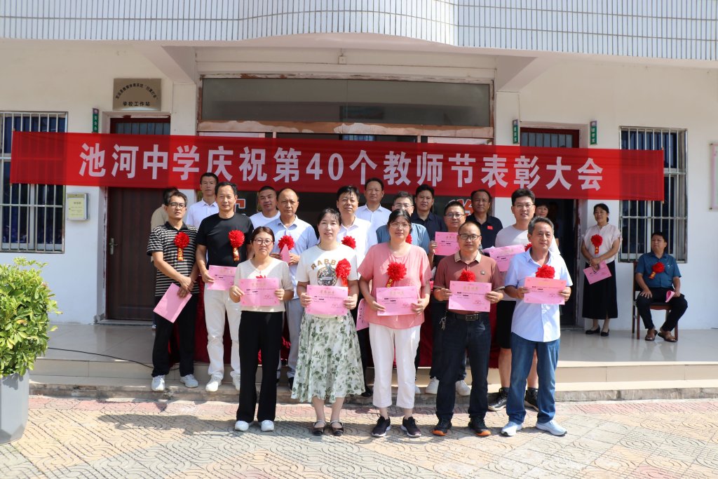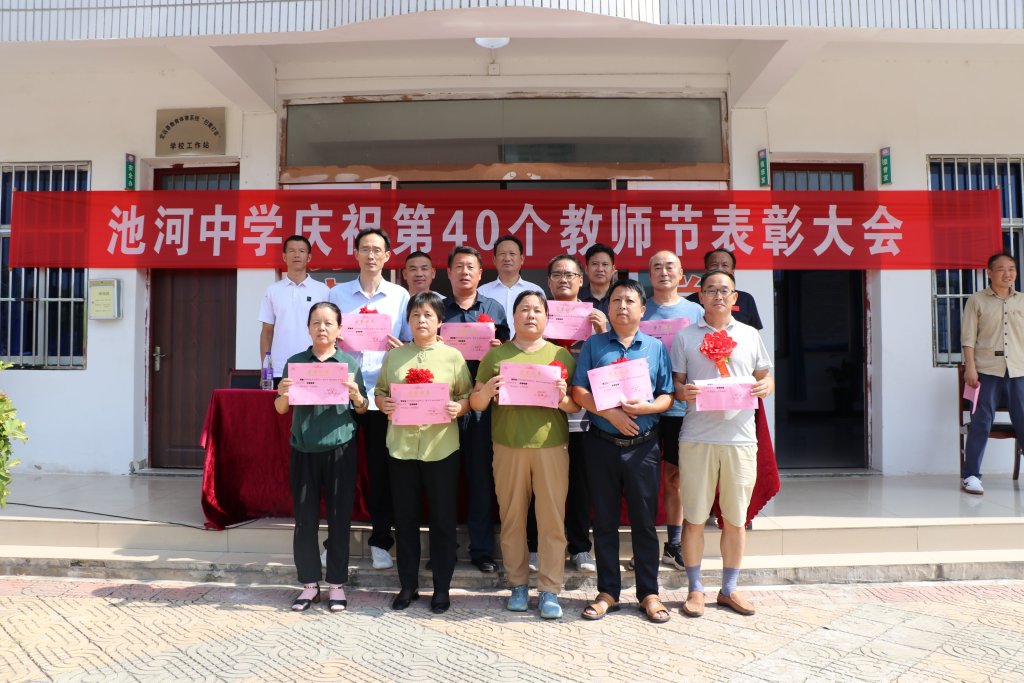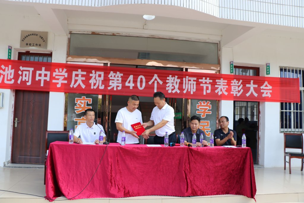 ~ 9月9日上午,在第40个教师节来临之际,为表彰先进,树立典型,发挥榜样的引领作用,定远县池河中学在青春广场前举行了2023-2024年度优秀教师表彰大会,对上一学年来在教育教学、班级管理、寄宿制管理、课后服务中表现优秀的36名优秀教师进行表彰。校党支部书记、校长欧健海出席会议并为发表重要讲话,大会由副校长杨正周主持,定远县优秀企业家:安徽省永存米业有限公司总经理陈彪、安徽省恒远粮贸有限公司总经理周朝军出席大会并为获奖教师颁发了获奖证书和奖金。