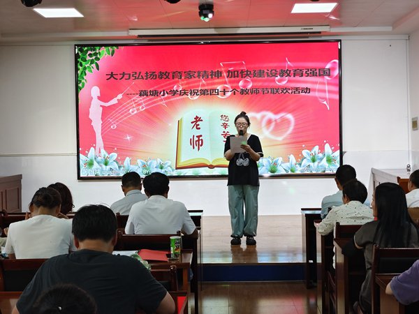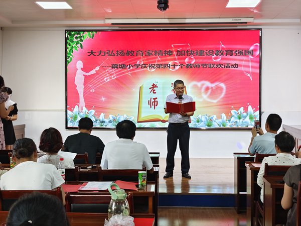 ~ 2024年9月9日,第四十个教师节前夕,定远县藕塘小学于多功能室举行了一场别开生面的庆祝活动,主题为“大力弘扬教育家精神,加快建设教育强国”,旨在向辛勤耕耘在教育一线的教师们致以崇高的敬意。