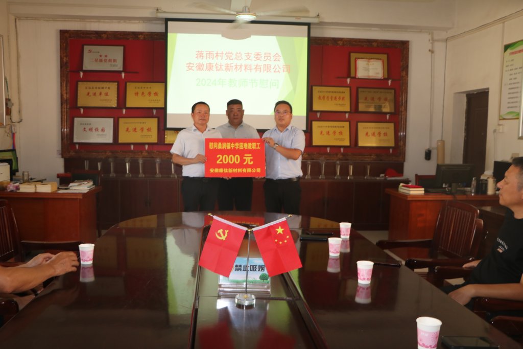 ~ 9月10日,桑涧镇蒋雨村党总支委员会携爱心企业安徽康钛新材料有限公司到桑涧初中开展教师节慰问。蒋雨村党总支委员会和安徽康钛新材料有限公司已经连续两年对桑涧初中开展教师节慰问活动。
