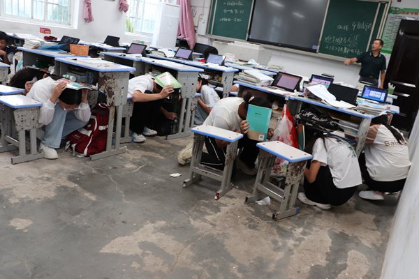 ~ 演练过程中,随着警报声的响起,同学们在老师的指导下迅速有序向操场撤离,大家沉着应对,纷纷弯腰、掩口鼻,撤离至安全区域。整个过程仅用2分钟。整场演练指挥有序、活动安全、教育有效,各班学生均按照预定路线“逃”出教学楼。各班班长清点并报告人数。