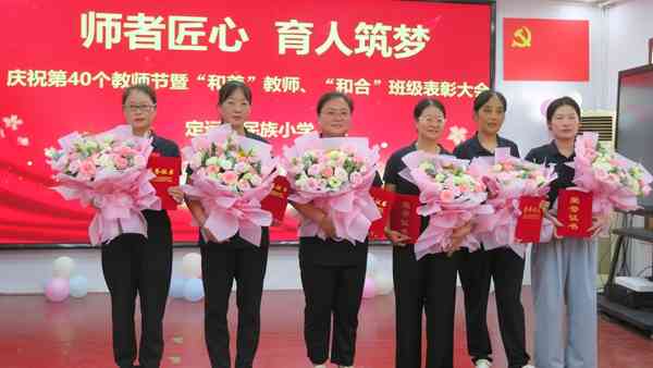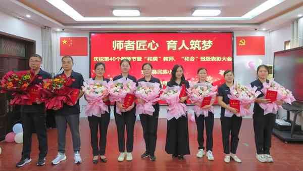 ~ 定远县民族小学教师节庆祝表彰大会9月10日在该校多功能教室召开,幼儿园和小学部全体教师120多人共聚一堂,欢庆第40个教师节,隆重表彰学校“和美”教师、“和合”班级等先进个人和集体,向刚刚离开工作岗位的四名退休教师表达了深深的敬意。