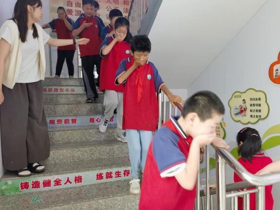 ~ 上午9:00,随着警报响起,全体教师依照预案迅速行动,引导学生们采取了正确的自我防护动作,弯腰、遮掩口鼻,遵照既定的疏散路线,有序迅速地转移到操场。