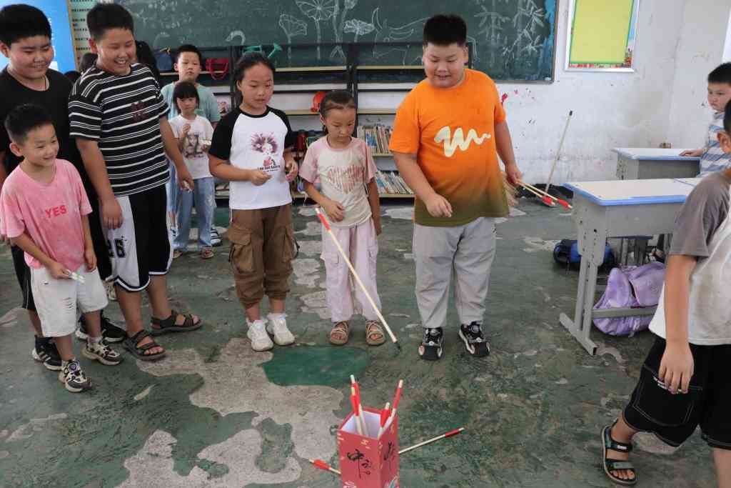 ~ 在天河小学各年级教室里,一场妙趣横生的游戏活动正在举行。一年级:蒙眼踏步;二年级:投壶;三年级:乒乓跳球;四年级:猜灯谜;五年级:后羿射日;六年级:筷子运球。