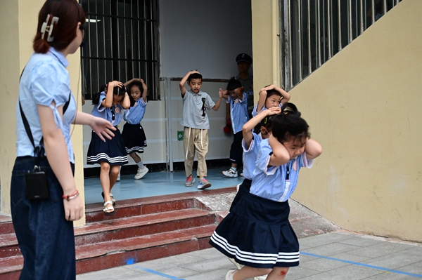 上午8:45,地震避险警报响起,预示强地震波将来袭。学生迅速护住头颈部,蹲在课桌下就地避险。待疏散警报响起,同学们在老师指挥下有序离开教室,弯腰、护头,迅速地按指定路线向操场撤离。各班紧急疏散到操场指定的安全区域后,班主任马上清点人数,确认疏散情况,并逐级向上汇报,过程井然有序。