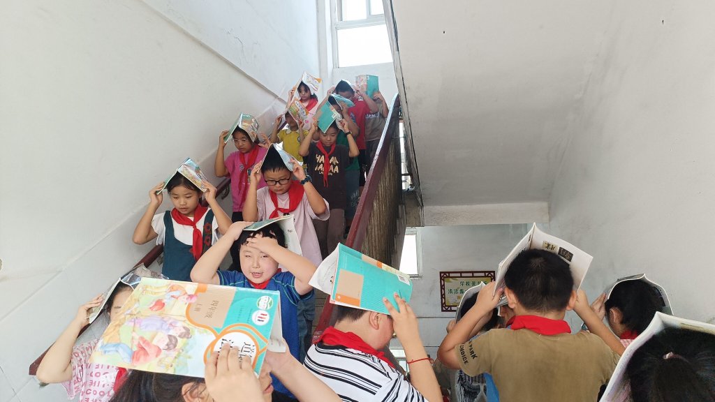 ~ 随着警报声突然响起,正在上课的师生们迅速做出反应。第一遍警报声后老师们组织学生应急避险,第二遍警报声后疏散。老师们沉着冷静,按照预先制定的应急预案,立即组织学生们躲在课桌下,用书本等物品护住头部。短暂的躲避之后,学生们在老师的指挥下,有序地沿着安全通道迅速撤离教学楼。他们弯腰低姿、用手护住头部,避免被掉落物品砸伤。