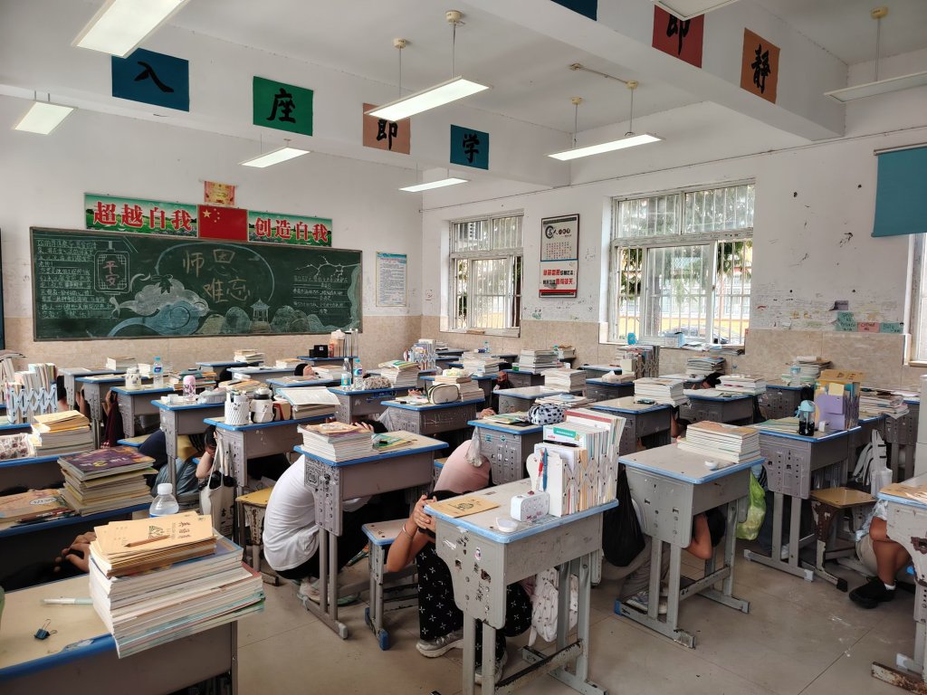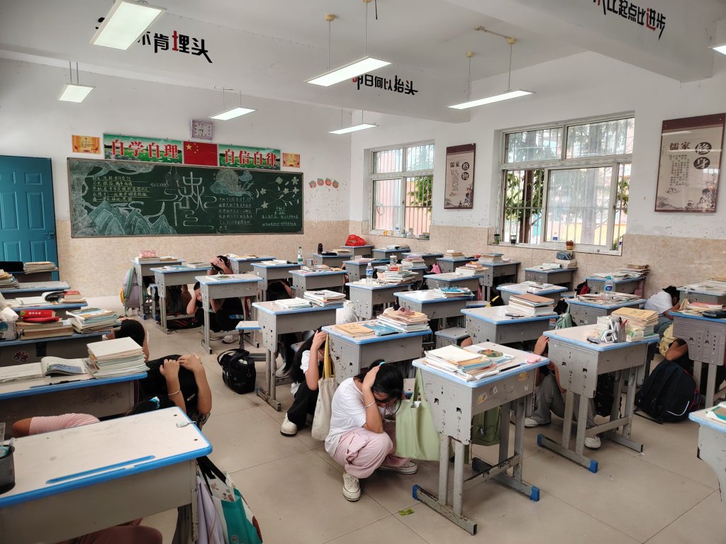~ 当天下午14点18分,随着急促警报声响起,防震避险疏散演练活动正式开始。各班学生在随堂老师的组织下,立即紧急避险,孩子们蹲下身体,使身体低于课桌,并用手或书本护住头部。此举是期望地震发生之际,让坚实的课桌给学生支撑起一片安全空间,最大限度地保障生命安全。