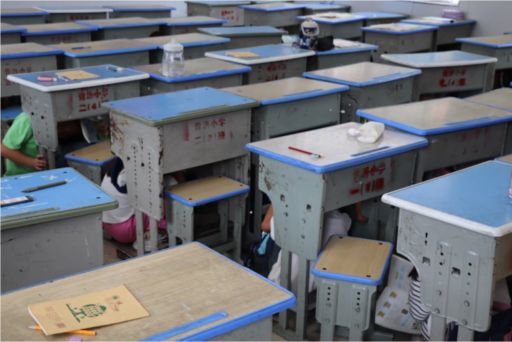 ~ 随着警报声的响起,老师们停止授课,指挥学生迅速蜷曲身体,躲在各自的课桌下,并尽可能用书包、课本或双手护住头部。听到逃生疏散口令时,老师带领学生们迅速撤离教室,沿着既定的安全疏散路线,迅速到达指定的安全区域。