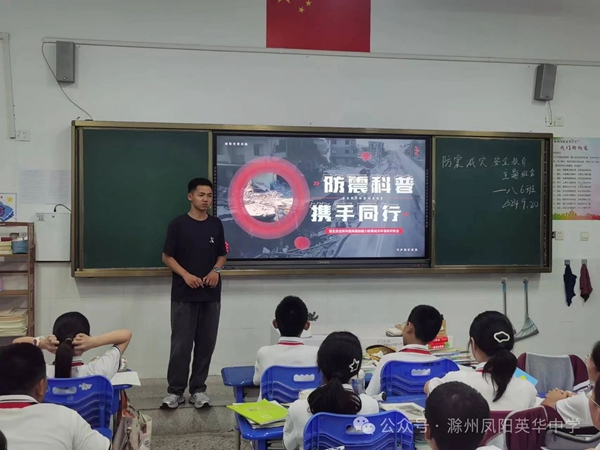 ~ 为进一步普及防灾减灾的知识,增强学生的避险救灾意识和自救能力,保证学生地震预报发布或地震发生后,快速、有序、高效地实施地震应急工作,9月20日晚,滁州凤阳英华中学八年级组织开展“防震科普,携手同行”主题班会课。