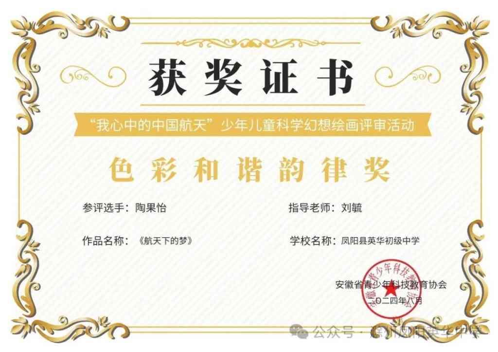~ 滁州市凤阳英华中学初中部陶果怡同学的作品《航天下的梦》(刘毓老师指导),在安徽省青少年科技教育协会举办的“我心中的中国航天”少年儿童科学幻想绘画比赛中荣获创新创意探索奖。