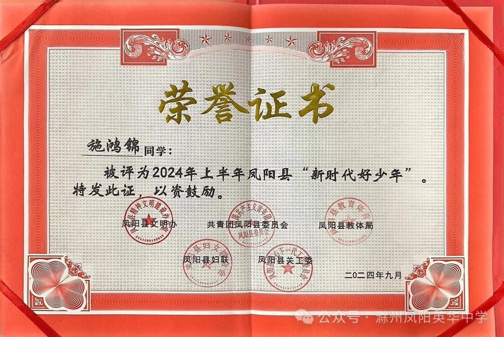 英华中学施鸿锦同学被评为凤阳县“新时代好少年”