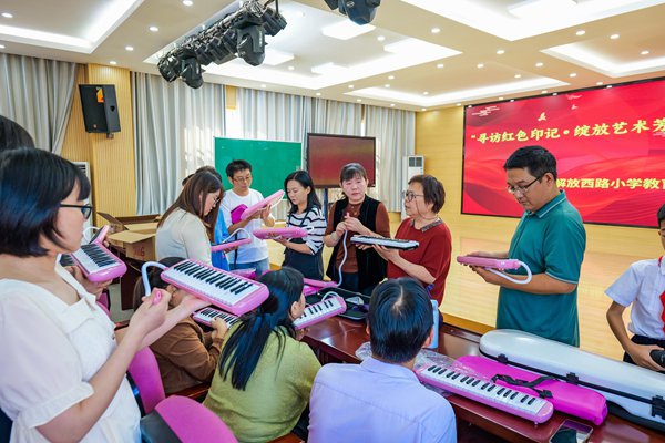 ~ 重温革命历史,铭记红色记忆,天门山校区师生来到藕塘烈士陵园祭奠英烈并且参观了定远县中共中央中原局第三次会议旧址,同学们寻访红色印迹,传承红色基因。随后走进定远校区,在南楼报告厅沙画社团的同学们进行了沙画现场展示,一掬平凡的细沙在行云流水般的指间滑落、起舞、挥洒、勾画,以沙为墨,用指代笔,刹那间变幻出种种画面。口风琴社团的同学们为大家带来演奏《贝加尔湖畔+喀秋莎》,美妙的音符娓娓道来,令人浮想翩翩,流连忘返。张婷婷和王莹老师的钢琴与小提琴合奏《兰亭序》更是让人惊艳,优美动听的旋律让人想起了古代文人墨客、山水田园和自然山川的壮丽美景。口琴魅力、琴韵悠扬,最后王静老师给定远校区的音乐老师进行了口风琴培训,从口风琴的握持与吹奏姿势、吹气与吸气技巧等方面传授知识和经验,老师们受益匪浅,为今后的口风琴特色教学打下了基础。活动最后两校区合影留念。