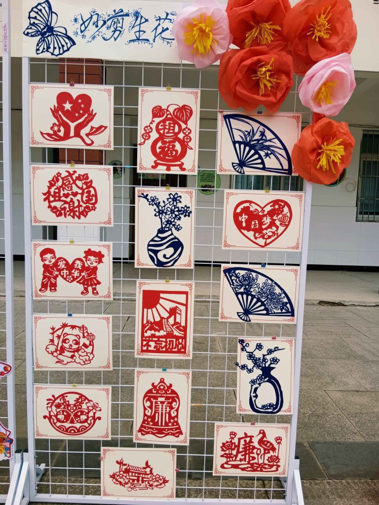 ~ 而剪纸作品则以其细腻的工艺和独特的造型,吸引了众多观众的目光。孩子们用灵巧的双手剪出了“爱我中华”、“感谢祖国”等文字,表达了他们对祖国的深深敬意。