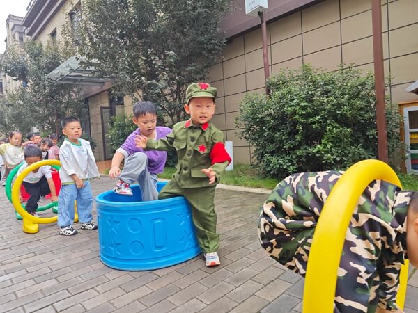 ~ 中班组的老师们和孩子们一同设计、一同构思,巧妙地利用园内的平衡木、爬行垫、拱形门等器材,设计了一系列寓教于乐的游戏活动,模拟了红军长征途中的翻雪山、过草地、突破封锁线等经典场景。孩子们在游戏中面对各种挑战,学会了勇敢面对困难,不怕苦、不怕累,他们争先恐后地扮演“小红军”,在模拟的长征路上锻炼自己的意志和勇气。