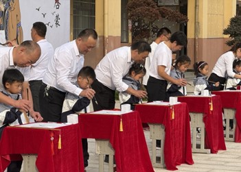 ~ 点朱砂,称为“开天眼”。意为开启智慧,以此寄托美好的愿望,从此眼明心亮,好读书,读好书,读书好。悠悠中华,穆穆华装;泱泱华夏,礼仪之邦;莘莘学子,堪当大任;击鼓三声,鸣志立誓。“人生聪明识字始”,写字识字是学习文化的第一步。开笔第一字,寓意着在人生的启蒙阶段,学会做人是最为重要的。