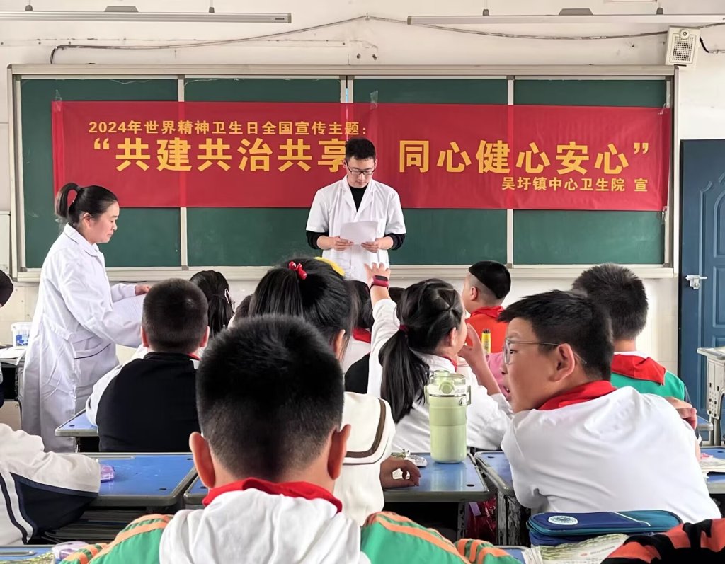 ~ 2024年10月10日是第33个世界精神卫生日,吴圩镇中心卫生院医务人员走进吴圩小学开展主题为“共建共治共享,同心健心安心”的健康讲座,提高学生对精神健康问题的认识,普及心理健康知识,消除对精神疾病的偏见,构建心理健康体系,共治心理健康问题,共享心理健康成果。