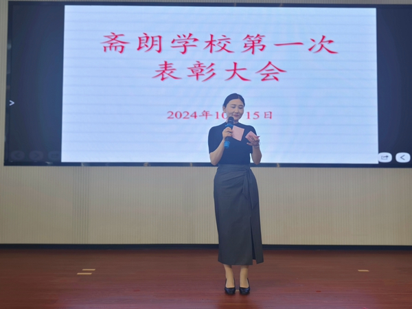 2024 年 10 月 15 日上午,定远县斋朗学校在报告厅举行优秀学生和模范教师表彰大会,此次大会由大队辅导员赵丽丽主持,校领导、全体师生共同出席此次大会。