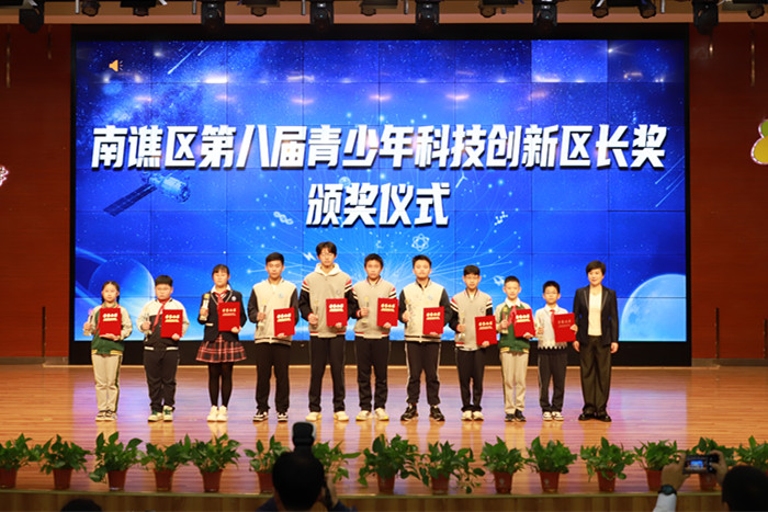 ~ 颁奖仪式上,滁州市永乐小学编排的情景剧《问月•飞天 》和歌曲《科学点亮未来》,精彩地表演获得大家的一致好评和阵阵掌声。接着,主持人李迪老师宣读了南谯区第八届青少年科技创新区长奖获奖名单,共有10名同学获奖,区委副书记、区长王莹为他们颁奖并合影留念。