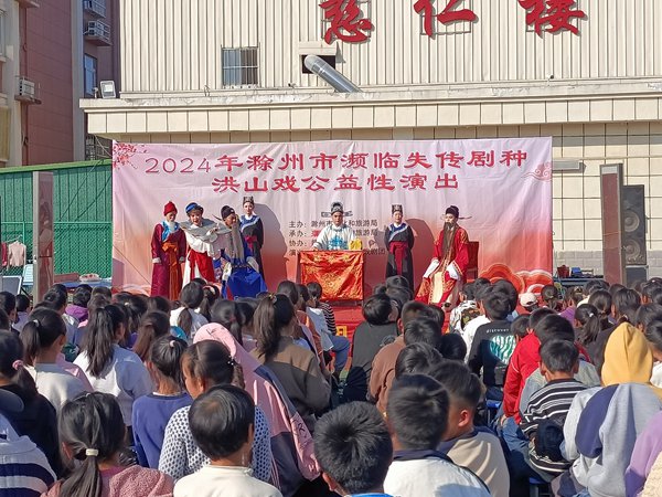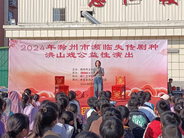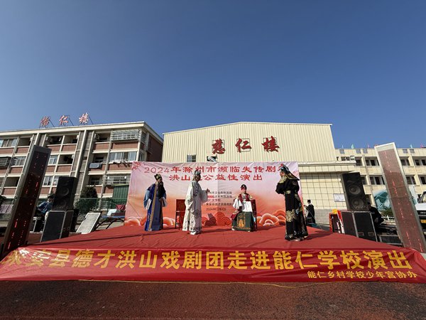 ~ 10月23日下午,由滁州市文化和旅游局主办,定远县文化和旅游局承办的“2024年滁州市濒临失传剧种洪山戏公益性演出”走进能仁学校。现场,来自来安县德才剧团的演员们为同学们带来一场精彩的戏曲视听盛宴。