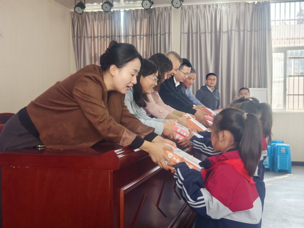 仪式上,张可庭校长对捐赠活动领导小组的到来表示欢迎和感谢。此次捐赠的图书种类丰富,涵盖了多个领域,为学生们打开了一扇扇知识的大门。书籍是人类进步的阶梯,在县邮政公司王玉权总经理和县总工会党组成员姚吉丽的发言中,我们深切感受到社会各界对留守儿童浓浓的关爱,他们希望通过这些图书,激发学生们的阅读兴趣,拓宽他们的视野,弥补家庭教育的缺失,丰富他们的精神生活,让他们在知识的海洋中茁壮成长。学生代表凡晨晨代表全校同学,向爱心报刊的叔叔阿姨们表示最诚挚的感谢和最崇高的敬意。她说道,对于渴望知识的学生来说,这些图书是无比珍贵的礼物,它们将陪伴每一位孩子度过许多美好的时光,在阅读中成长,在学习中进步,认真阅读,用心体会,从书中汲取智慧和力量,以优异的成绩回报社会的关爱和期望。