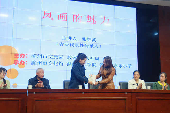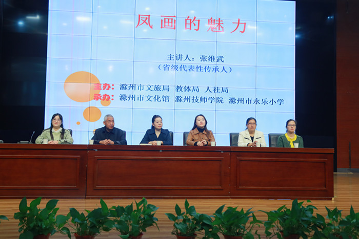 ~ 为弘扬中华优秀传统文化,传承与保护地方非物质文化遗产——凤画艺术, 10月24日,由滁州市文旅局、滁州市教体局、滁州市人社局主办,滁州市文化馆、滁州市技师学院承办的滁州市“大手拉小手”凤画非物质文化传承活动走进滁州市永乐小学。安徽滁州技师学院社会文化艺术系副主任、凤画省级传承人陈海珍,凤画传承人马立敏、张维武以及滁州技师学院凤画社团志愿者,深入该校开展凤画推广和传承活动。