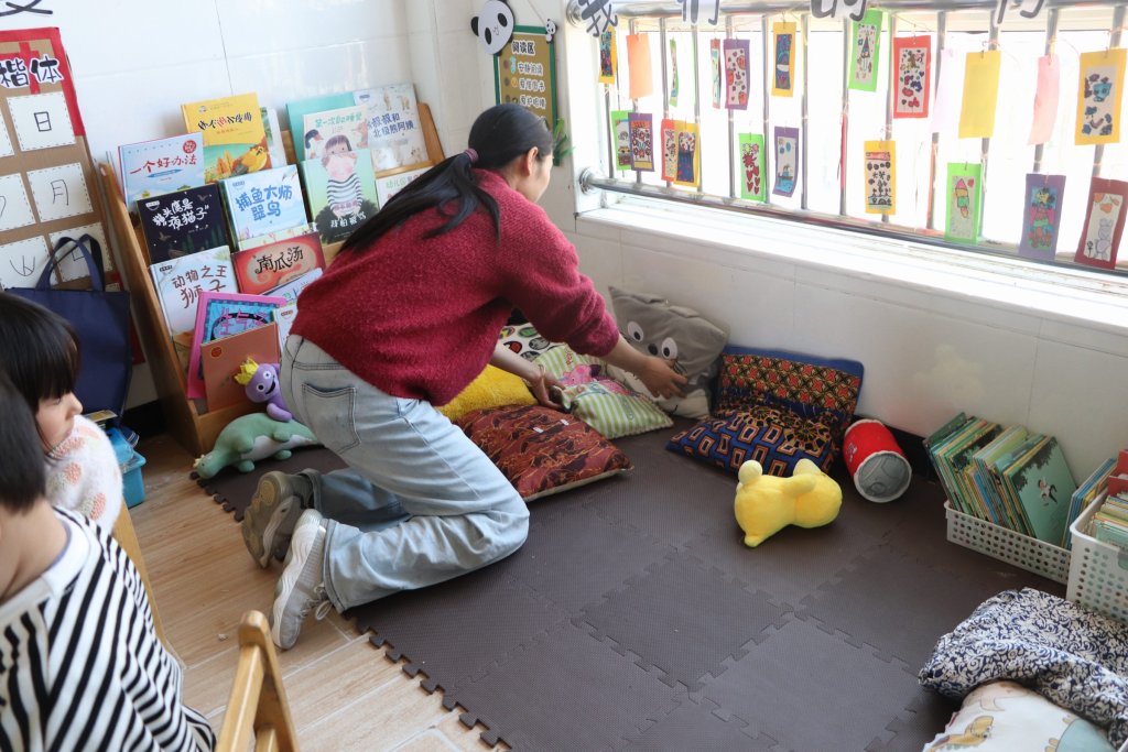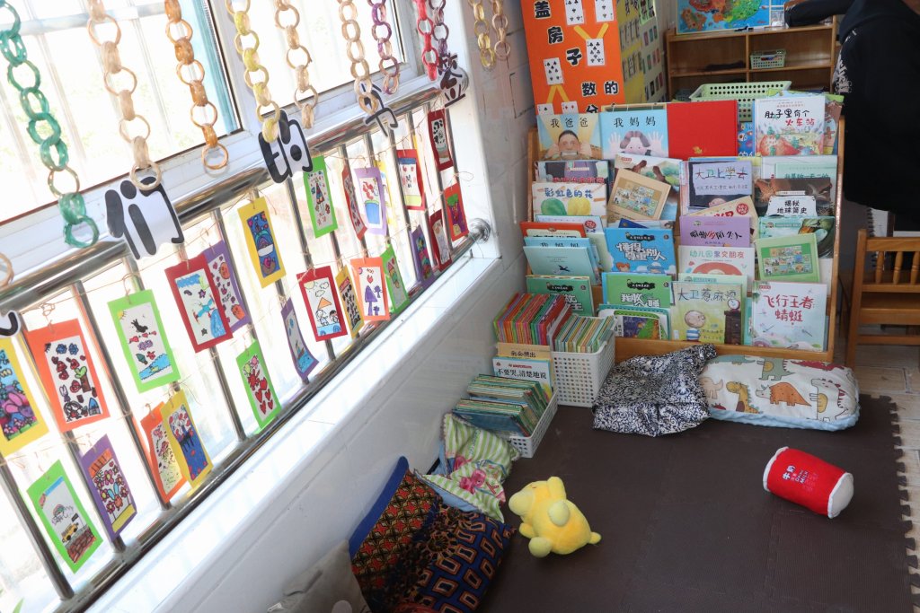 幼儿园班级进行了整体改造,使用手工制作和绘画作品装饰,还设置了专门的阅读区,美工区和建构区,幼儿的玩具教具也更丰富了。