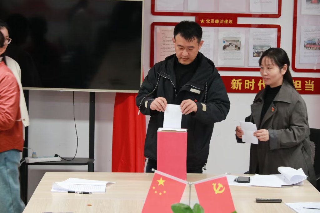 ~ 会议表决通过了新一届委员会委员组成人员建议名单,副书记邵国辉宣读选举办法(草案),及选举工作人员名单。全体党员严格按照选举程序进行了选举活动,以无记名的投票方式,郑重地投下自己庄严的一票,差额选举产生了学校新一届支部委员(按姓氏笔画排序):丰安周、米德转、邵国辉、周翔、黄海山。新当选的支部委员们纷纷表示,将树牢“四个意识”,坚定“四个自信”,做到“两个维护”,积极发挥“双带头人”作用,在学习上做“领头羊”,在工作上当“排头兵”,在遵规守纪上当“模范者”,以实际行动践行初心使命,以过硬的纪律作风推动学校工作高质量发展。