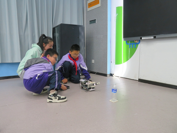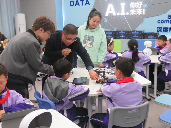 ~ 在AI人工智能创新实验室,学生社团的孩子们讲解了自己编制的程序的原理,并运用这些程序灵活操控科大讯飞人工智能机器人“小飞”和“未来派”智能组件完成预设的任务。实验室负责人介绍了学校科学课程开设和科技创新社团活动的情况,学校智能化、数字化、信息化设备在提升学生科学素养、创新能力方面正发挥着重要的作用。