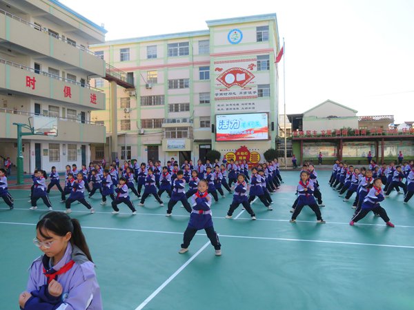 ~ 活动在学校大课间武术操《弟子规》展示中拉开了序幕。崭新的操场上,孩子们精神抖擞,排成整齐的队伍,伴随着缓急变化的音乐,拳脚肘膝,闪转腾挪,一招一式,或柔中带刚,或势如破竹,展现了民小阳光少年的风采和中华传统文化的独特魅力。
