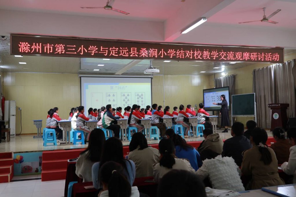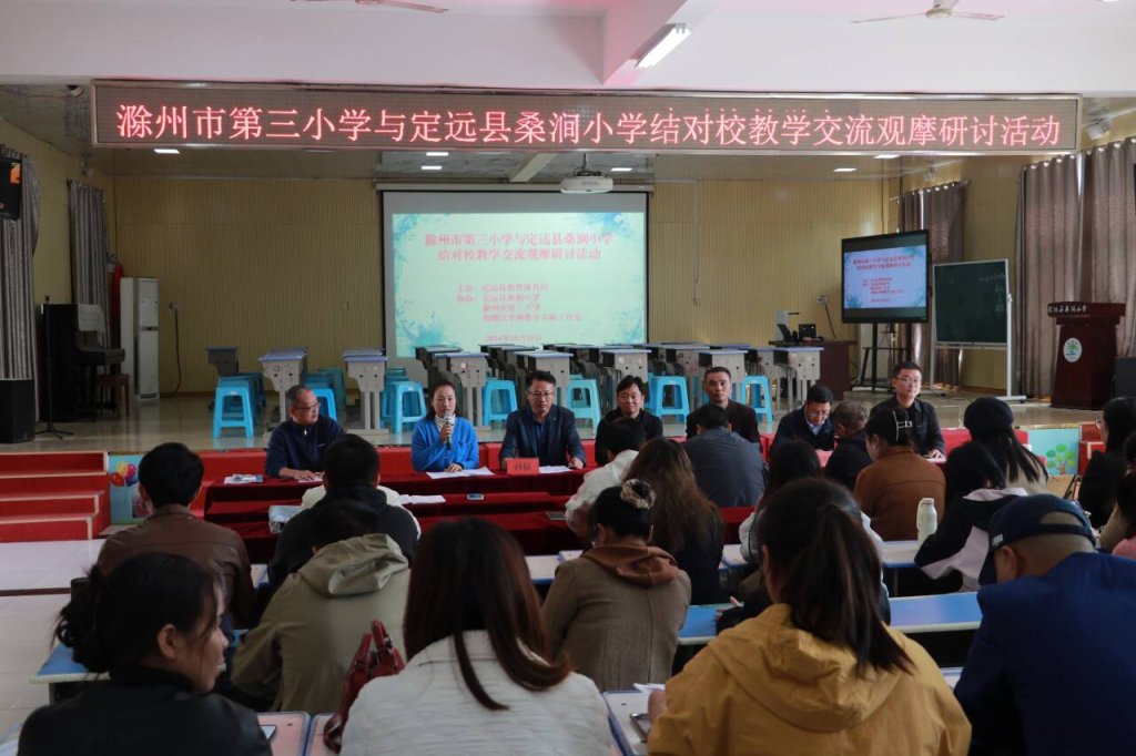 ~ 为扎实做好滁州市第三小学与定远县桑涧小学结对共建工作,提高课堂教学品质,提升教师专业能力,促进区域教育均衡发展,10月25日,滁州市第三小学校长李鹏飞、副校长李刚及教师一行13人来到定远县桑涧小学开展教学交流观摩研讨活动。定城片、池河片部分语文、数学、英语教师参加了此次活动。