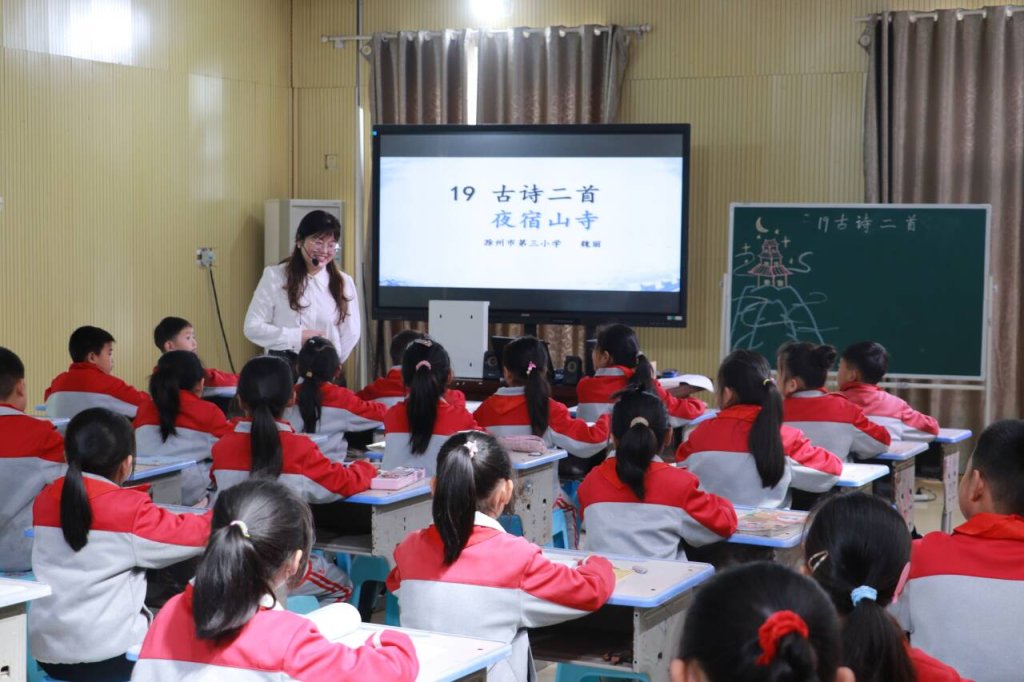 ~ 滁州市第三小学教师魏丽、赵庆、单荣静、陶再义分别执教二年级语文《夜宿山寺》、五年级数学《用字母表示数》、三年级英语Unit3 Amazing animals B. Start to read、六年级道德与法治《多元文化 多样魅力》四节示范课,定远县桑涧小学骨干教师姚秀娟、刘雯分别执教六年级语文《伯牙鼓琴》、二年级数学《线段的初步认识》两节汇报课。