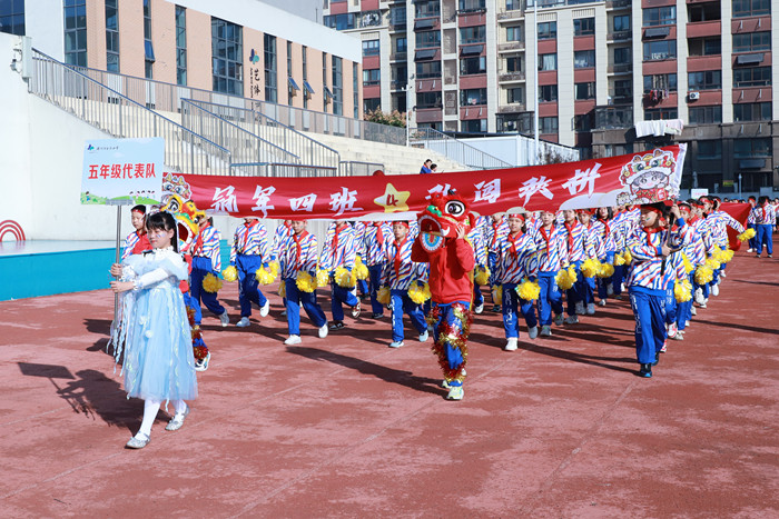 ~ 伴随着激昂的运动员进行曲,各方阵依次入场。首先映入眼帘的是国旗护卫队和校徽队,他们迈着整齐的步伐,高擎国旗手举校徽,庄严而神圣。紧随其后的是彩旗队,鲜艳的旗帜在风中舞动,为校园增添了一抹亮丽的色彩。各年级的运动员代表方阵各具特色,同学们身着统一的服装,步伐矫健,依次走过主席台。他们口号响亮、精神抖擞,充分展示了该校的风采和同学们的青春活力。期间,四年级同学还带来精彩地表演团体舞《中国范》。