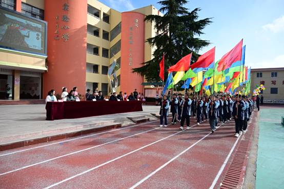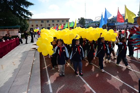~ 曲阳路校区的操场上,少先队员高擎国旗、校旗,肩扛校徽首先入场,由32名少先队员高举彩旗所组成的彩旗方队紧随其后,32名少先队员手持五彩缤纷的气球在主席台前一字排开,面向主席台站定。高擎国旗、校旗,肩抗校徽的少先队员们进入场地后在操场中央肃立。彩旗队队员分列操场前排。伴着运动员入场曲,2893名学生以班级为单位组成58个方队,在老师的带领下挥舞国旗、花环、气球、充气棒等,喊着具有班级特色的嘹亮口号入场。深秋的操场,彩旗猎猎、领巾飘扬。