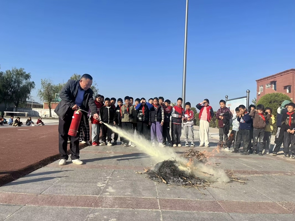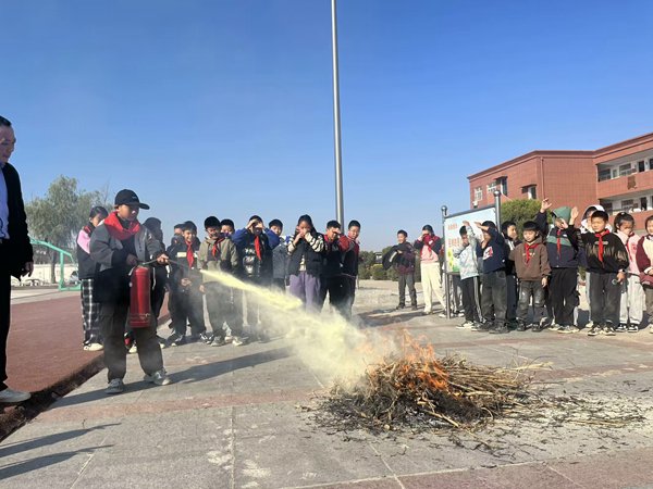 ~ 在操场上,学校安全办主任黄玉香向学生们展示了灭火器的正确使用方法,并进行了实际操作演示。学生们积极参与,亲身体验了灭火的过程,进一步增强了他们的消防技能。