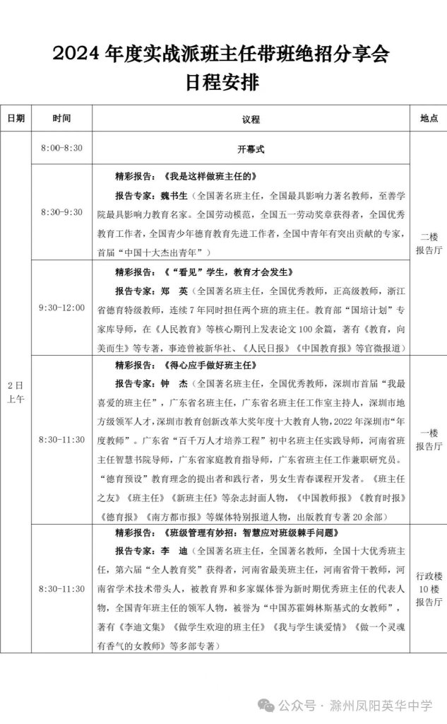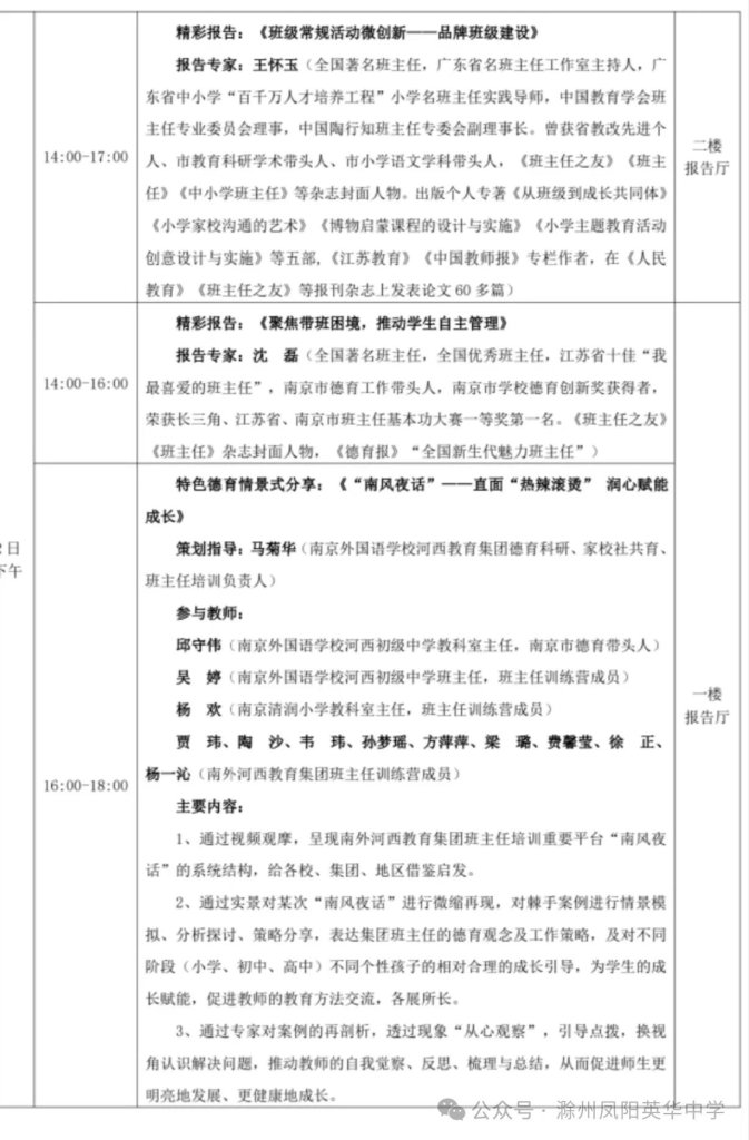 ~ 为进一步拓展教师教育视野,提高学校教育教学质量,加强和推动班主任工作建设,学习优秀学校的先进教育理念和管理经验,全面提升学校办学质量,11月1日,滁州凤阳英华中学一行8人在高中部德育副校长高助业带领下,赴南京参加了为期4天的“影响班主任—2024年班主任大会暨2024年度实战派班主任带班绝招分享会”。