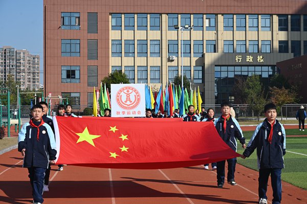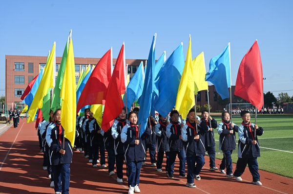 ~ 在秋日和煦阳光下,实验小学教育集团东兴路校区秋季运动会盛大开幕。全校师生齐聚一堂,共同见证这场体育盛宴的开启。 11月5日上午9时20分,伴随着庄严的运动员进行曲,东兴路校区运动会入场式正式拉开序幕。首先映入眼帘的是国旗队,他们步履坚定,英姿焕发。手中的五星红旗在阳光下熠熠生辉,犹如一颗颗跳动的爱国心,引领着队伍庄严前行。