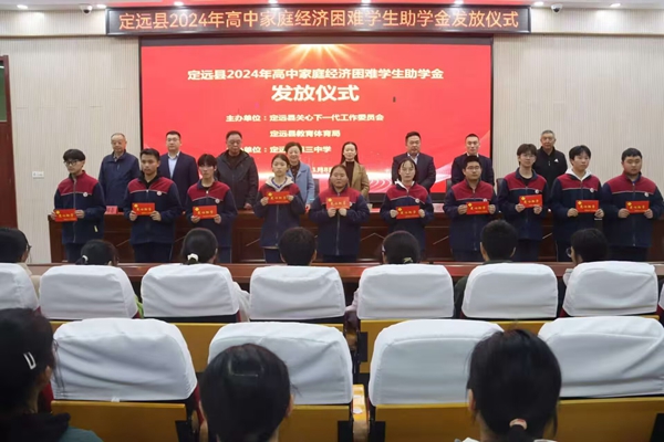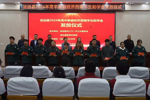 ~ 11月8日,2024年高中家庭经济困难学生助学金发放仪式在定远三中科学馆一楼会议室举行。定远县关工委副主任、县救助协会会长刘训秀,县教体局关工委主任唐仁凤,定远三中党委书记孙凯,定远县救助特困学生协会会副会长、定远县心之惠超市董事长孙学好等出席仪式。定远三中30位受资助学生参加活动,仪式由唐仁凤主持。
