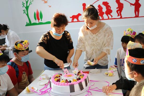 校领导和代理家长们亲手给小寿星们戴上生日的“皇冠”,切蛋糕、分发给小寿星们。留守儿童代表发言中,说出了留守孩子们的心里话——感谢给了他们生命的爸爸妈妈,感谢谆谆教导他们的老师,感谢培育他们茁壮成长的母校,