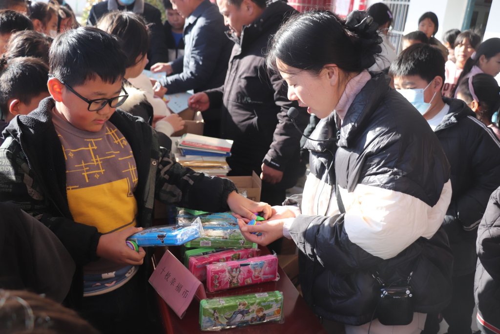 ~ 学生们排着整齐的队伍,积极参与此次活动,他们拿着自己辛苦得来的“幸福币”兑换着各种各样精美的奖品,脸上洋溢着开心的笑容。