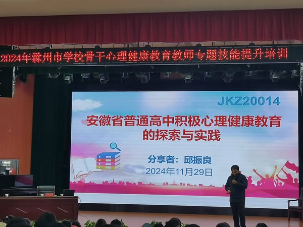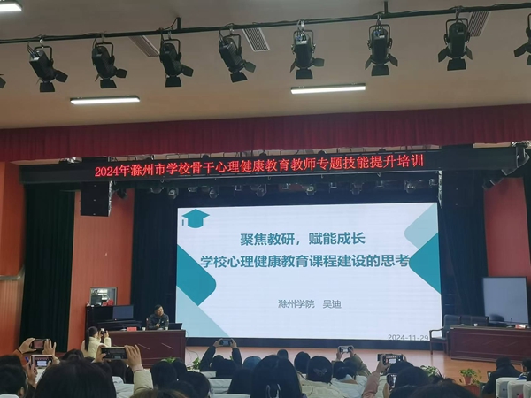 王标首先向各位参训老师表达了热烈的欢迎。他指明骨干心理健康教育教师作为推动未成年人心理健康教育工作的中坚力量,需要不断提升自身的专业素养和实践能力。然后,滁州学院教师教育公共教学部副主任吴迪老师带来了《聚焦教研,赋能成长——学校心理健康教育课程建设的思考》的首场讲座,他从明确课程的目标定位、把握课程建构的原则、创新课程教育方法与手段等方面,为老师们提供了诸多有益的思考方向。宿州市泗县第一中学专职心理健康教师邱振良则以《积极心理学视角下普通高中心理健康教育的探索与实践》为题,分享了一系列创新的教学方法和实践案例,引领老师们深入领略积极心理学与学科融合所展现出的魅力。