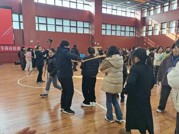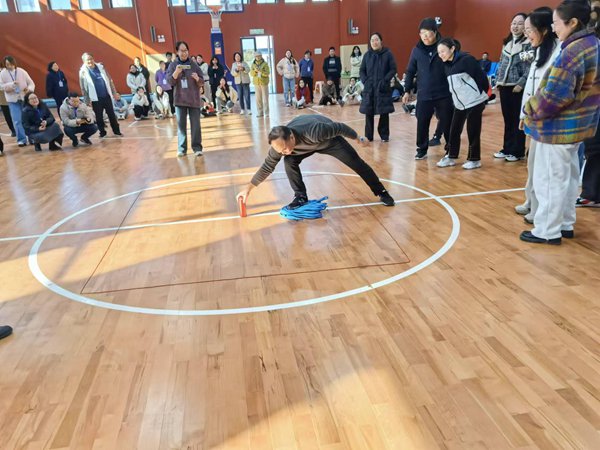 “异掌同声”“扭转乾坤”“寻找同盟”等破冰游戏迅速拉近了老师们之间的距离,大家在欢声笑语中进行破冰交流,确定队名、口号和队形,凝聚起团队力量。在“步调一致”“智取核弹”“逃脱困境”等游戏活动里,老师们进一步提升了团队默契,不仅释放了压力,还锻炼了身体协调性。“长龙戏珠”“鼓动人心”“同舟共济”等户外趣味项目充分激发了老师们的专注力与协作力;震撼人心的“动力圈”游戏中,教师们共握一条长绳,围成圆圈,齐心协力完成指定动作,绳索如波浪般律动,每位老师都深刻感受到团结和信任所带来的巨大能量。