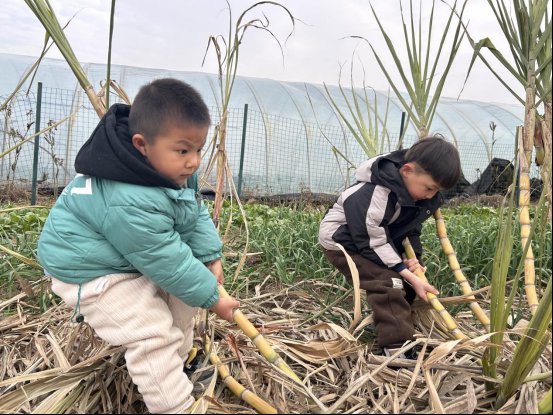 ~ 大班的孩子们卷起衣袖,铆足了劲儿挖起红薯来,不多会儿,一个个红薯躺在泥土上,孩子们的脸上充满了幸福感和自豪感。中班的小朋友们在老师的指导下用力握着赶着的根部,使劲往上拔,终于将甘蔗从泥土里拔出来。大大的萝卜胖嘟嘟的,一个个埋在土里,小班幼儿一边用力一边嘿呦嘿呦的唱着《拔萝卜》,开心极了。