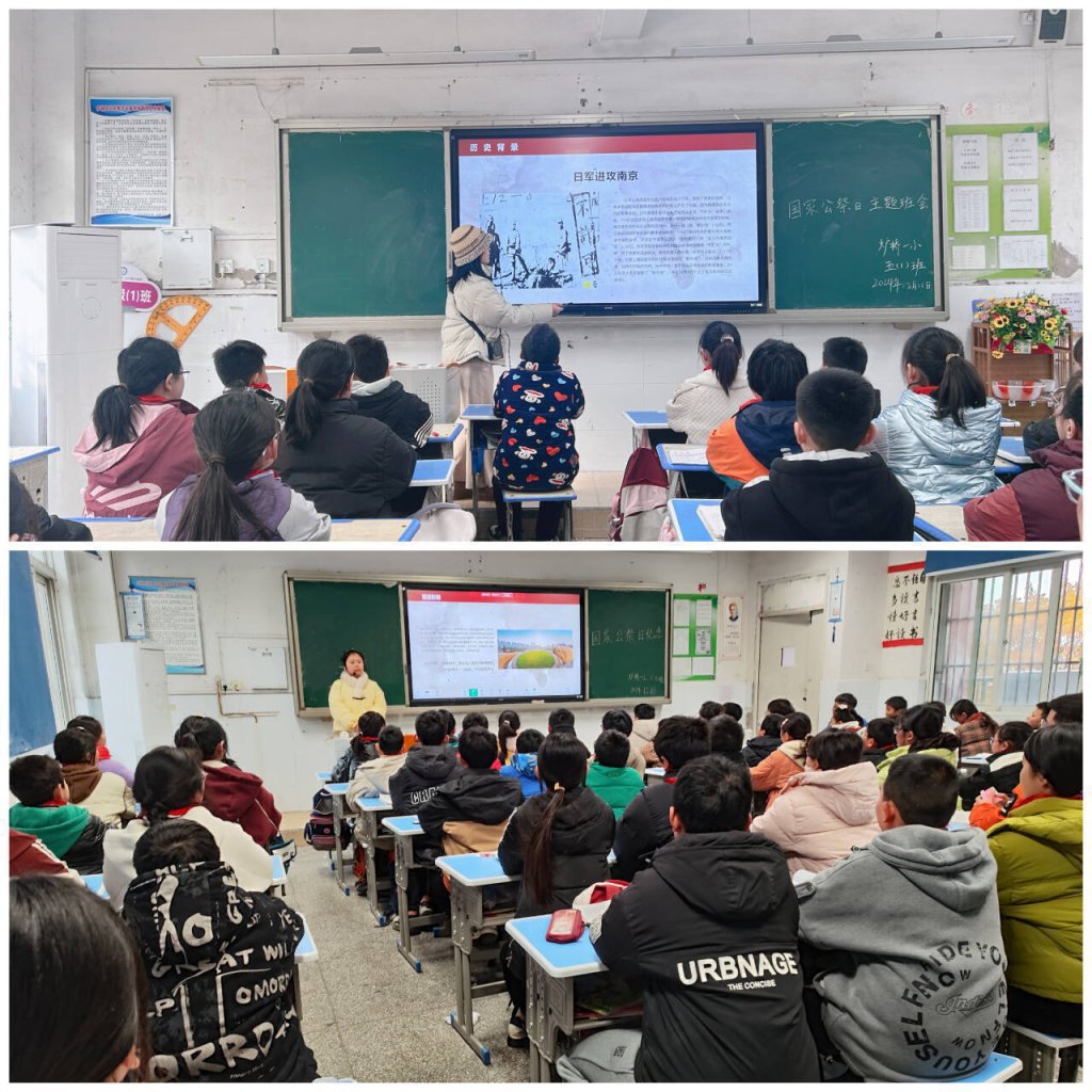 ~ 各个班级组织了主题班会活动。班会课上,老师们通过播放南京大屠杀的纪录片片段、展示珍贵的历史图片等方式,向同学们直观地展现了那段沉痛而血腥的历史。孩子们的神情变得凝重,眼中满是对侵略者暴行的愤慨,也深刻认识到了和平的来之不易。